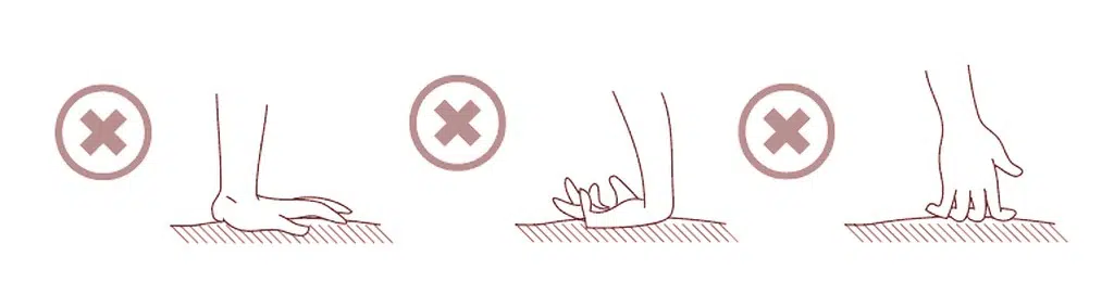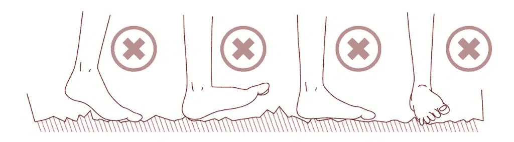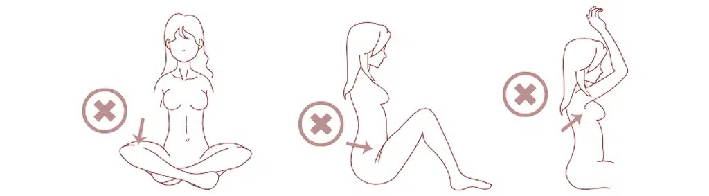 El ángulo de apertura de las piernas que recomendamos es de 50º como máximo a ambos lados y no más de 15º de la línea vertical del cuerpo hacia el interior. Para una sola pierna no debe levantarse más de 90º y doblarse hacia atrás más de 15º de la línea vertical del cuerpo.