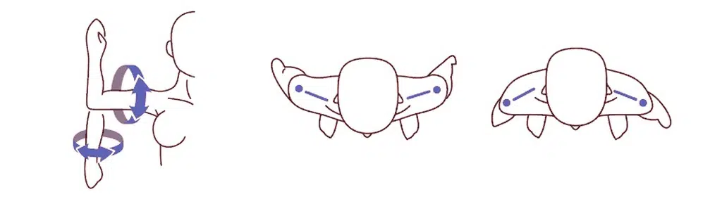 La parte superior de los brazos puede ser levantada hacia adelante hasta la altura del pecho, es decir, unos 60º hacia adelante. Los brazos pueden ser doblados ligeramente hacia atrás de 5 a 10º. La posibilidad de encogimiento de hombros únicamente está disponible en las muñecas sexuales con esqueleto plus. Si deseas esta posibilidad en tu Sex Doll tienes que optar por una muñeca sexual personalizada.