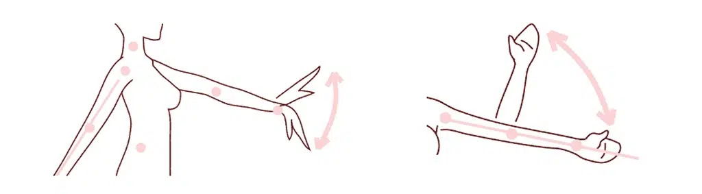 Los brazos de las muñecas sexuales realistas pueden ser levantados a ambos lados horizontalmente hasta el nivel del pecho, es decir, unos 60º. Cuando los brazos superiores son doblados hacia adentro (abrazando el pecho), nunca deben sobrepasar el pecho, es decir, unos 15º hacia adentro.